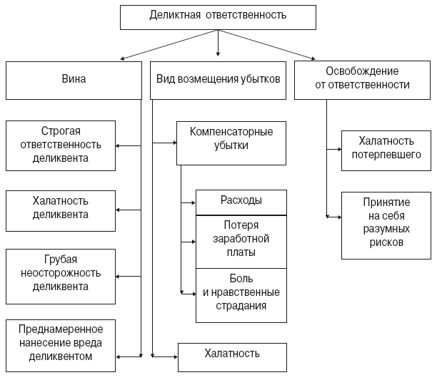 Классификация деликтной ответственности представлена в табл. 1. Классификация деликтной ответственности в зависимости от вида ущерба представлена в табл. 2.