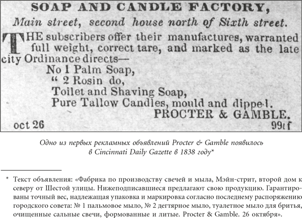 Procter & Gamble появилась на свет как маленькая компания в неспокойном море появляющихся и исчезающих на глазах фирм. Англичанин Уильям Проктер был владельцем магазина и свечных дел мастером, ирландец Джеймс А. Гэмбл – мыловаром. Оба основателя изучили свое ремесло на родине, совершенно независимо друг от друга прибыли в Цинциннати и открыли там предприятия. По воле судьбы их жены были сестрами: Оливия и Элизабет Энн Норрис. В 1837 году, во время банковского кризиса, предшествовавшего резкому экономическому спаду, их тесть Александр Норрис (также занимавшийся свечным делом) предложил, чтобы два предпринимателя объединили свой бизнес. Исходя из 3000 долларов, заработанных Проктером до этого времени, партнеры установили начальный капитал объединенного предприятия в размере 7192,24 доллара. После того как 31 октября Гэмбл смог выплатить свою половину, два предпринимателя подписали формальное соглашение об основании фирмы. А к концу первого года ее существования партнеры поместили рекламное объявление в Cincinnati Daily Gazette{4}.