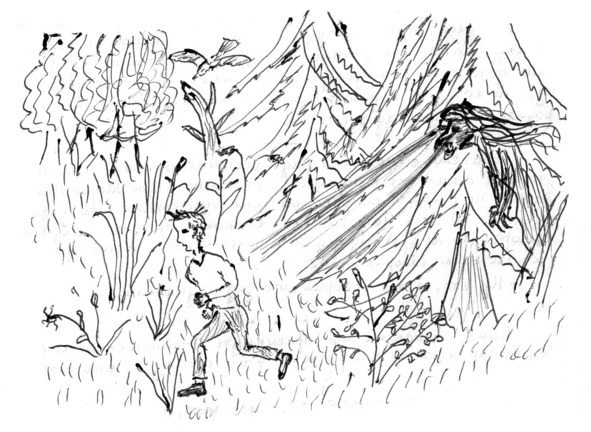Вдруг Ванюша почувствовал на себе чей-то жуткий прожигающий взгляд. Было совершенно ясно, что на него сзади смотрит какое-то страшное существо. Он резко обернулся, но никого не увидел, только на дереве закачалась ветка, будто там за деревом кто-то прятался, а может быть, просто взлетела птица. Ванюша, наполненный непонятным жутким страхом бросился бежать домой. Бежал, не чувствуя дороги, куда глядели глаза, лишь бы подальше от того страшного места. Усталости не чувствовалось, был слышен сильный стук своего сердца, кровь бросалась в голову. Перепрыгнув с разбегу через ручей, мальчик узнал его. Он тут же умылся, загребая побольше холодной успокаивающей воды, которая остужала голову.