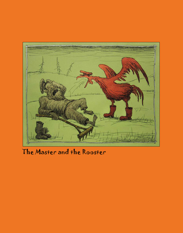 The master woke up and pushed the rooster who was not allowing him to sleep away. The rooster thought that the master wanted him to sing louder, so he crept closer and began to shout with all his might: