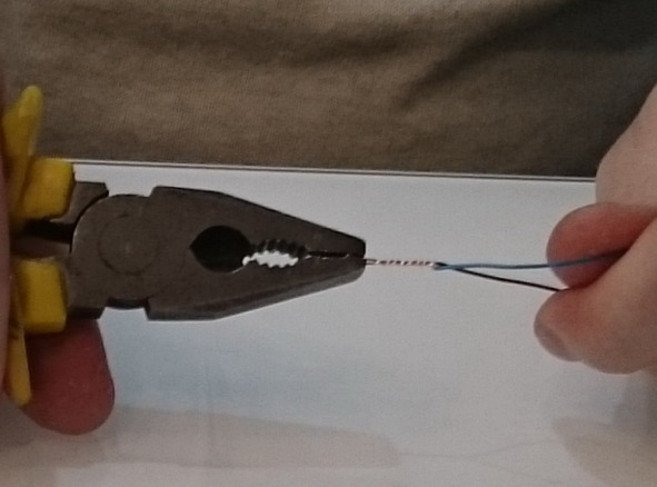 Давайте разберемся пошагово: во-первых, надо снять изоляцию с кончиков проводов. В нашем деле применяются слаботочные провода с тонким слоем изоляции. Поэтому удобнее снять ее с помощью зажигалки, а не ножа, таким образом, сам провод не повредится. В данном случае вовсе не нужно жечь изоляцию до тех пор, пока она не превратится в угли. Просто подержите провод над пламенем 1—2 секунды. Изоляция нагреется и размякнет. Пока она еще теплая, вы легко снимите ее двумя пальцами. Во-вторых, делаем скрутку. Рисунок слева демонстрирует захват плоскогубцами кончиков проводов.