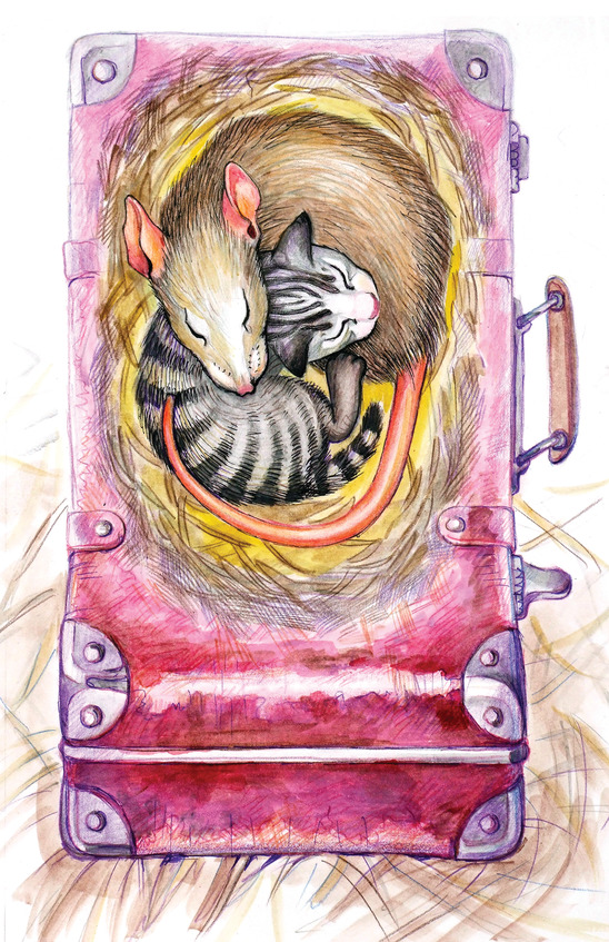 Голоса удаляются, а матёрая крыса с разорванным ухом и оторванным кончиком хвоста, – та самая, которую только что Шебаршана выгнала из своего чемодана, подходит к перевёрнутой корзине и воровато озирается. Но тут из-за угла появляются две озорные мордашки – Чух и Жух. Это весёлые крысиные подростки, не упускающие случая побаловаться. Из-за угла они быстренько выкрикивают дразнилку: