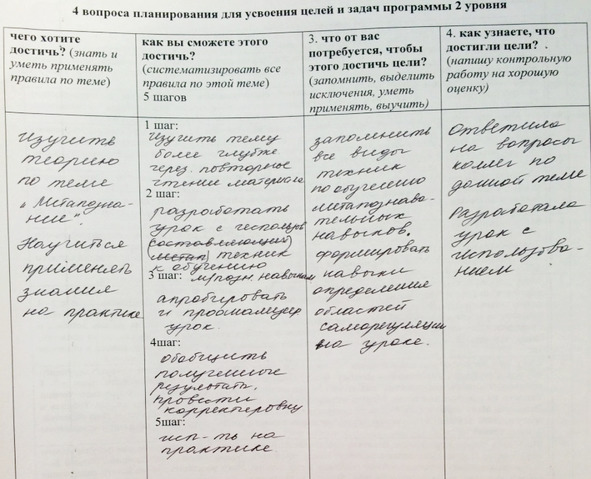 На рисунке 1 видно, как учитель отмечал свое продвижение в усвоении каждого из модулей программы. Вместе с тем за одну сессию учитель не достигал отметки 10 (полного усвоения материла модуля), что в свою очередь натолкнуло на идею включения в исследование еще одного коучингового инструмента «Четыре вопроса планирования». Данный инструмент позволил учителям развивать рефлексивную культуру и продумывать свою дальнейшую траекторию в изучении модулей программы в случае, если в рамках сессий не был достигнут максимум в усвоении того или иного материала (рис. 2).