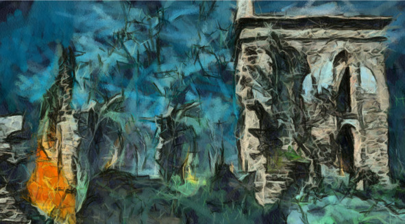 Томас завёл лошадей в помещение, бывшее некогда кухней, судя по очагу, хотя бандиты тут устроили склад ненужного хлама. Однако, тут ничего не капало сверху, не дуло, и лошади чувствовали себя немногим менее удобно, чем в добротной конюшне. Сир Яго немного копошился, пытаясь развести огонь, но дрова, что разбойники предусмотрительно притащили, хотя и был сухими, разгораться не собирались. Плюнув, он ел рядом с девицей, поскольку там было сухо, хотя и на кучу странного вида хлама, вроде обломков какой-то телеги. Томасу пришлось довольствоваться перевёрнутым котлом, закрыв над собой пространство старой попоной, валявшейся в импровизированной конюшне. Дождавшись, когда все усядутся, сир Яго продолжил рассказ, прерванный в самом неподходящем месте.
