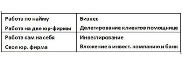 На 4-ом курсе академии я устроился к очень хорошему юристу. Я до сих пор называю его вторым папой, он не только научил меня выигрывать судебные заседания, но и по вечерам после работы мы шли в «пироговую», где он рассказывал мне правила жизни. Это одни из ценнейших советов, которые помогают мне в жизни и «по сей день», за что я ему очень благодарен. На пятом курсе очного юридического образования я работал уже на две юр фирмы одновременно, у меня была девушка, 3 раза в неделю тренажерный зал, хватало время и на друзей. Когда я приходил домой, вырубался меньше чем за минуту, но с улыбкой на лице. И в 21 год, когда получил высшее образование, начал работать сам на себя, причем с 1-го клиента выходило ровно же столько, сколько за 1 месяц работы в начале карьеры, а это в среднем 250 $. И через 4 месяца мы с моей девушкой поехали во Вьетнам. В те две недели путешествия, я первый раз попробовал делегировать все помощнице, которая с успехом со всем справилась, и сейчас, пока я на Бали, она продолжает вести моих клиентов, за что ей безмерно благодарен. Научившись управлять финансами, уже через полтора месяца я отмечал Новый год в Тайланде. Для чего я все это рассказываю? Если вы читали Роберта Киосаки и помните его денежный квадрант, то вот вам наглядный путь движения от «работы по найму», «работы сам на себя» к «бизнесу» и «инвестированию». Да, книга «Богатый папа, бедный папа» резко изменила мою жизнь в 17 лет. Не будем вдаваться в подробности, а выделим главную суть книги.