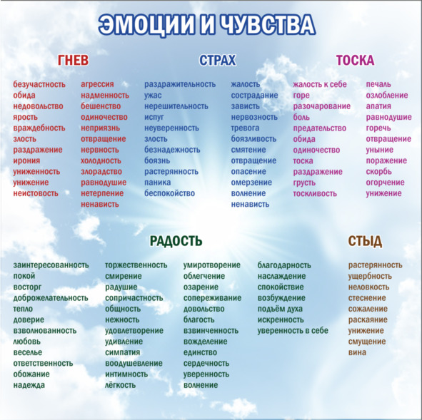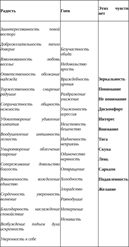 Пытаться бороться, не замечать свои собственные эмоции и переживания – это верный способ умножить свои страдания, запутаться в проблемах и потерять душевный покой. Сделав свою жизнь невыносимой, человеку пытающемуся выздоравливать от алкоголизма или наркомании, не остается ничего иного как снова возобновить употребление. И поэтому работа с собственными чувствами, их распознавание, отслеживание и, наконец, сообщение о них окружающим являются важными задачами реабилитации. Дневник чувств поможет: научиться различать собственные чувства и с их помощью глубже познать самого себя; осознать свои реакции и поступки, а значит, получить возможность изменить поведение, которое мешает наладить взаимоотношения с другими людьми. Так как у пациентов на начальном этапе бывают проблемы с формулированием эмоций и чувств, специалисты им выдают своеобразную «шпаргалку» со списком чувств, такой же плакат висит на стене (табл.6).