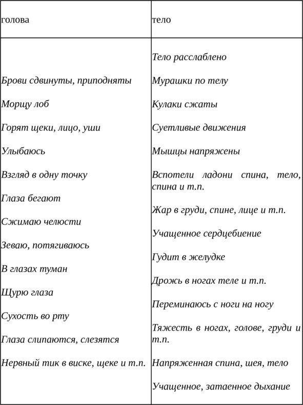Для облегчения выражения чувств и реакции тела пациентам предлагаются следующие памятки (табл.7, 8)