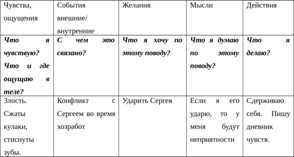 Дневник чувств, используемый на протяжении всей реабилитации, позволяет эффективно анализировать актуальное эмоциональное состояние (табл. 5). Рекомендуется отталкиваться от эмоции, испытываемой в настоящий момент, для установления причинно-следственной связи с какой-либо ситуацией. Следует отметить, что эмоция не обязательно может быть связана с событием из внешнего мира, но и, например, может быть результатом воспоминания, фантазии, – того, что можно назвать «внутренним» событием: