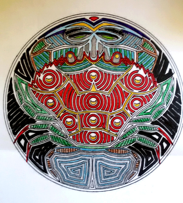 Так, пациентка А. (рис.6) в задании нарисовать или представить свою зависимую часть (портрет, фигуру, схему-как угодно) изобразила её в виде мандалы, (которую подобрала из книги антистрессовых раскрасок),где сверху нарисованы глаза (маски), а в центре «костер гнева» (ярко-красным цветом),который символизировал её повышенную агрессивность. (Если приглядеться картина напоминает краба). В поведении на отделении она цеплялась к любому слову, реплике, которые, как её казалось, угрожали её самоуважению. В последующей психодраме она заявила тему «боюсь быть слабой женщиной». Началась глубинная работа над нарушенными объектными отношениями. К концу срока пребывания на реабилитации стала значительно спокойнее, легче выдерживала критику, повысилось самоуважение.