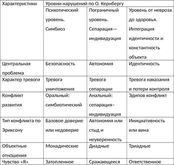 Теория О. Кернберга хорошо соотносится с эриксоновскими стадиями детского развития и ролевого развития Я. Морено и представляет ориентир для психотерапевта. Так, например, если у пациента имеется чувство вины, это указывает, что проблема возникла в трех—пятилетнем возрасте – в период инициативы—вины. Даже если пациент точно не укажет возраст, все равно психотерапевт ищет корни проблемы, возникшей примерно в этот период.