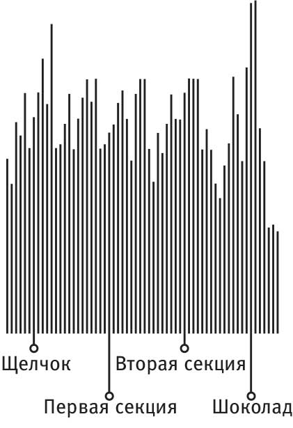 Чтобы лучше понять, как работает эта система, вернемся к графику неврологической привычки у крысы. Обратите внимание, что активность мозга резко усиливается в начале лабиринта, когда крыса слышит щелчок, и в конце, когда она находит шоколад.