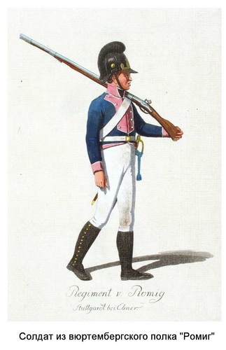 В 1806 году я и многие мои друзья были призваны на военную службу по объявленной в то время мобилизации, и был определен в полк «Ромих», который впоследствии был переименован во «Франкемон» и получил номер 4.[1] Этот полк входил в состав гарнизона Людвигсбурга. Осенью, вместе с полком, я отправился в Прусскую кампании, которую император Наполеон с другими государями, своими союзниками, начал против Пруссии. Осенью мы прошли через Эльванген, Нюрнберг, Ансбах, Байройт, Плауэн, саксонский Дрезден, а затем через Бунцлау в Гроссглогау,[2] в Силезию, где оставались в гарнизоне в течение примерно трех недель.