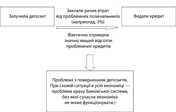 Банків значно менше, ніж підприємств, вони такі важливі, що за ними встановлено практично щоденний нагляд Центрального банку. Уявіть собі великий будинок. Банківська система – це його несучі стіни. Коли все добре, вони просто і непомітно виконують свої функції. Вони не завжди розташовані у вдалих місцях, навіть деколи хочеться знести парочку. Але цього просто так робити не можна, вся будівля може обвалитися.