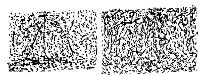 На некоторых картинках, как на той, что слева, имелись слабозаметные изображения, в данном случае – парусный кораблик. На других, вроде той, что справа, не было ничего, кроме произвольно расположенных штрихов. Студенты должны были сказать, видят ли они осмысленный рисунок. Почти все заметили кораблик и другие настоящие изображения. Интересно, что многие участники признавались, что видят рисунок там, где на самом деле были только случайные пятна. На 12 картинках не было изображено ничего осмысленного. В среднем на девяти из них студентам виделись рисунки.