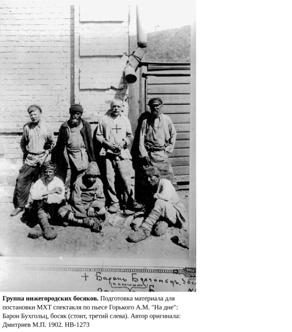 а) «Жестокость и равнодушие ночлежников» (их отношение к Анне); б) «издевательство над всяким (?!) проявлением человечности» (отношение Барона и других к Насте); в) «искаженные (?) представления о чести и совести»; г) «утверждение жульничества и обмана как основного закона жизни» (эпизод игры в карты в начале второго действия); д) «нетрудовая психология ночлежников». Конечный вывод, сформулированный методистом, жесток и категоричен: будучи жертвами эксплуататорского буржуазного общества, босяки, включая и Сатина, «сами являются носителями его пороков и потому не могут по своей природе быть борцами за переустройство мира».