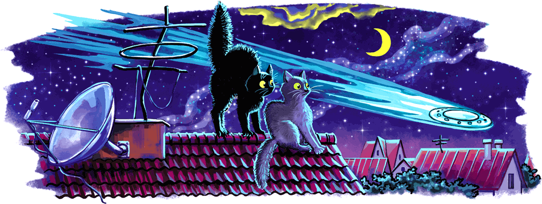 В два часа ночи жители городка уже крепко спали, поэтому никто не заметил яркой вспышки, пронесшейся в тёмном небе над крышами зданий. Небольшой космический корабль из серебристого металла летел быстро, словно комета. Длинный хвост из огня и дыма только усиливал это сходство. Пролетев над уютными зелёными улочками и аккуратными домиками городка, корабль устремился в сторону леса и начал быстро снижать скорость.