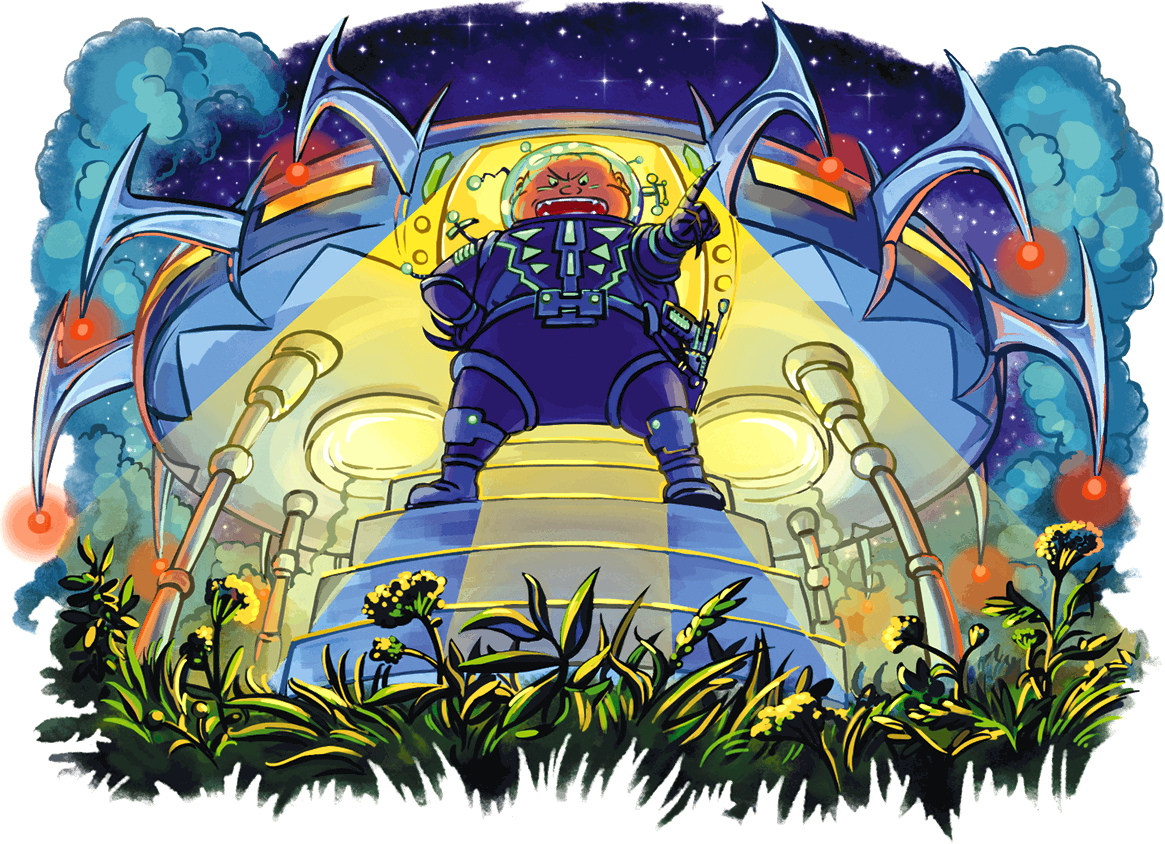 На трап ступил невысокий коренастый тип в серебристом скафандре. Его руки покрывали серебристые перчатки с острыми когтями, а на голове сидел большой прозрачный колпак, похожий на аквариум.