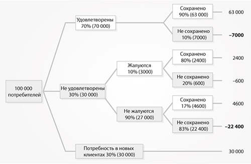 На рисунке 1.7 показано, насколько важно сосредоточиться на неудовлетворенных клиентах, которые не жалуются. У компании 100 000 клиентов, 70 % из них удовлетворены, а 30 % нет. Каждый год компания теряет 30 000 клиентов и должна найти им замену, чтобы сохранить размер своей базы. Из 70 000 удовлетворенных клиентов она теряет только 7000. Остальные 23 000 не удовлетворены, но большинство из них не жалуются. В данном примере 10 % из 30 000 неудовлетворенных клиентов жалуются, и 80 % из них (2400 человек) удается удержать. 90 % (27 000) не жалуются, и из них удается удержать лишь 17 % (4600), а 83 % (22 400) уходят. Быстрый расчет показывает, что неудовлетворенные и не жалующиеся составляют 75 % клиентов, которых ежегодно теряет компания.