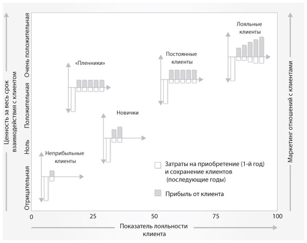 У большинства компаний есть клиенты с разными уровнями лояльности и прибыльности. Лояльные имеют более долгую историю взаимоотношений с компанией, более привержены бренду, больше покупают и чаще рекомендуют. Долгая история есть и у постоянных клиентов, но они менее привержены бренду, меньше покупают и реже готовы рекомендовать бренд другим.