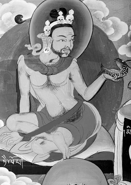 На западе, в храме Сомапури, властелин йогинов Тилопа попросил заковать свои ноги железными цепями и так практиковал двенадцать лет. Он обрел обычные сиддхи лицезрения Йидамов. Овладев грубым уровнем первоэлементов и источников сознания, он намеревался удалиться для глубокой йогической практики, но поскольку Лама и наставник не дали на это разрешения, Тилопа не стал нарушать их волю. Но когда он явил чудо перенесения сознания рыбы в пространство, оба поняли, что он обладает сиддхами, и решили отпустить его, куда ему захочется. И Тилопа отправился к Ачарье Нагарджуне в Южную Индию.