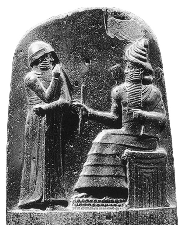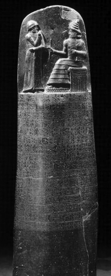 Кодекс Хаммурапи (1750-е гг. до н. э.) был обнаружен в ходе раскопок на территории города Сузы. На стеле изображен царь Вавилонии, получающий этот свод законов от бога солнца.