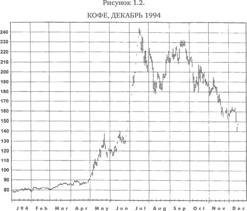 МИСС ТЕНДЕНЦИЯ (Переходит в атаку.) Или это. (Показывает график декабрьских 1994 г. контрактов на кофе (рис. 1.2).) Я могла бы продолжить.