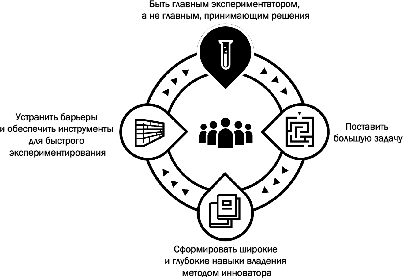 В-третьих, лидер должен формировать широкие и глубокие навыки владения методом инноватора – это необходимо, чтобы убедиться, что организация в состоянии создавать инсайты, находить проблемы, которые требуют решения, быстро генерировать прототипы решений. Четвертая роль лидера – устранить барьеры, мешающие переменам, и наладить систему, упрощающую быстрые эксперименты для проверки гипотез команды и разрешения неопределенности на каждом шагу.
