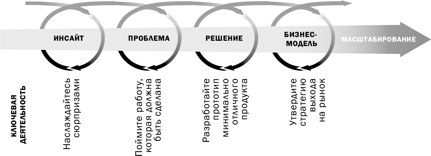Метод инноватора начинается с генерирования инсайтов в проблему потенциального покупателя, отыскивания сюрпризов, ключей, симптомов. Слово «проблема» мы на равных основаниях применяем для потребностей или проблем как для внешних покупателей, так и для пользователей внутри (например, в Intuit половина проектов была направлена на решение неудовлетворенных потребностей покупателя, а другая – на внутренние нужды компании, такие, как развитие лучших технологических возможностей для обслуживания покупателей или создание лучших условий труда). Инсайт (проникновение в суть, интуитивное понимание, озарение) может прийти откуда угодно, именно поэтому каждому сотруднику Intuit было дано 10 % нерегламентированного времени для генерирования идей и участия в стартап-командах. По нерепрезентативной выборке мы поняли, что инсайты возникали чаще всего через наблюдение за пользователями или покупателями и через общение с покупателями, сотрудниками Intuit и самыми разными людьми вне Intuit.