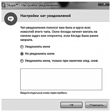 То же касается и мессенджеров на компьютере. Например, в скайпе можно «заглушить» отдельные чаты. Как известно, многие групповые переписки, созданные по работе или для обсуждения конкретного проекта, рано или поздно превращаются в «курилку», где обсуждается все подряд. Выбирайте такую переписку, заходите в меню «Беседа» и ищите пункт меню «Настройки уведомления»: