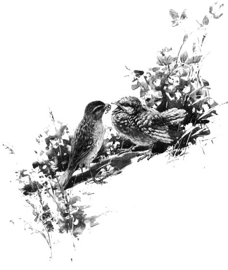 The egg is always laid betimes, and is usually the first to hatch, the period of incubation being a day or two less than that of the eggs of the foster-parent. And woe be to the fledglings whom fate has associated with a young cow-bird! He is the "early bird that gets the worm." His is the clamoring red mouth which takes the provender of the entire family. It is all "grist into his mill," and everything he eats seems to go to appetite—his bedfellows, if not thus starved to death, being at length crushed by his comparatively ponderous bulk, or ejected from the nest to die. It is a pretty well established fact that the cuckoo of Europe deliberately ousts its companion fledglings—a fact first noted by the famous Dr. Jenner. And Darwin has even asserted that the process of anatomical evolution has especially equipped the young cuckoo for such an accomplishment—a practice in which some accommodating philosophic minds detect the act of "divine beneficence," in that "the young cuckoo is thus insured sufficient food, and that its foster-brothers thus perish before they have acquired much feeling."