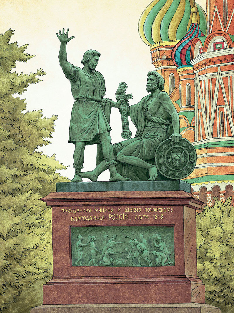 В 1818 году на Красной площади появился самый первый памятник в Москве. Он и сейчас стоит перед собором Василия Блаженного. На постаменте[1] надпись: «Гражданину Минину и князю Пожарскому благодарная Россия». За что же этим людям такая честь: первый в Москве памятник, на главной площади столицы да ещё и с благодарностью от всей страны? А дело в том, что в конце шестнадцатого – начале семнадцатого века на нашу землю пришла большая беда. После смерти царя Иоанна Четвёртого (Ивана Грозного) и его сыновей не осталось в России законного правителя. Новым царём стал боярин[2] Борис Годунов, но народ не любил его. Люди шептались о том, что это Борис Годунов приказал убить сына Ивана Грозного царевича Дмитрия, чтобы самому стать царём.
