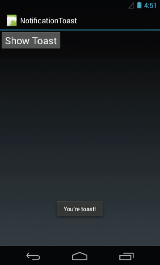 Теперь давайте посмотрим на пример приложения, которое использует тост-сообщения. Это приложение выводит на экран единственную кнопку, подписанную «Show Toast». Если нажать эту кнопку, то в нижней части экрана вы увидите маленькое раскрывающееся окно, которое говорит: «You’re toast!».