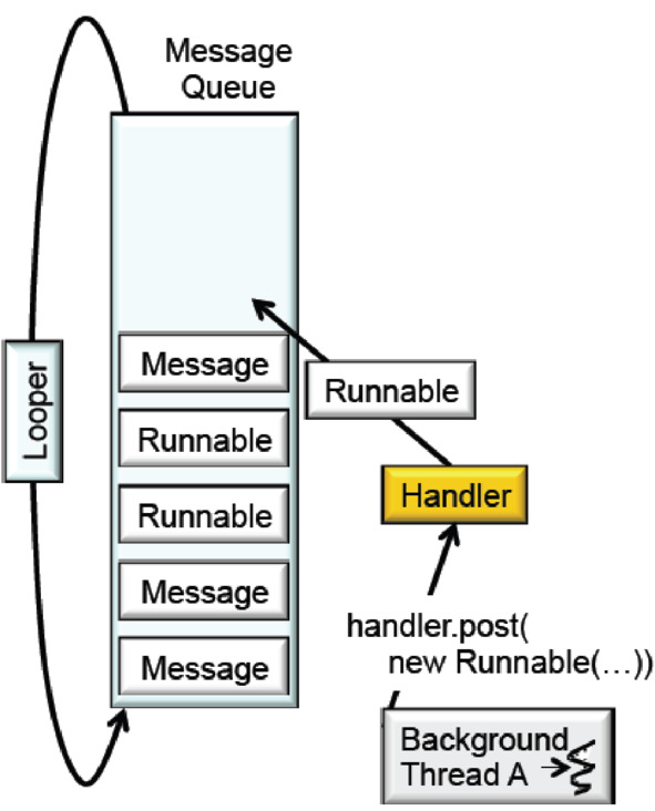В Android каждый поток связан с очередью сообщений – messageQueue и петлителем – Looper. Очередь сообщений – структура данных, которая содержит сообщения и объекты runnable. Петлитель забирает эти сообщения и объекты runnable из очереди сообщений и диспетчеризирует их в зависимости от обстоятельств.