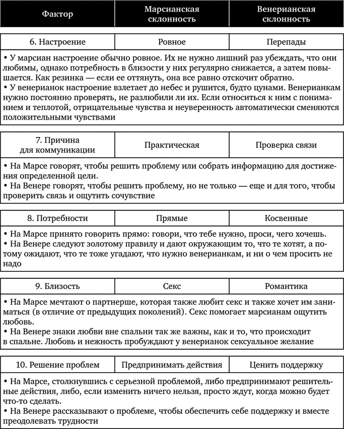 Ниже перечислены двенадцать основных факторов, чаще всего ведущих к недоразумениям между мужчинами и женщинами в относительно традиционных семейных отношениях. Однако в современном мире, более сложном, где женщины берут на себя традиционно мужские роли, они автоматически перенимают и многие марсианские склонности. И наоборот – поскольку мужчины понемногу начинают играть традиционно женские роли дома, у них появляются некоторые венерианские черты. Когда будете читать этот перечень, подумайте, какие черты больше свойственны лично вам. В чем вы и ваш партнер с Марса, а в чем с Венеры?