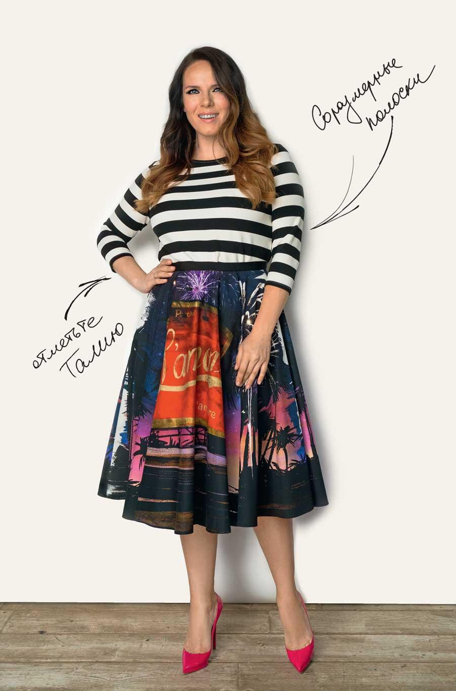 Если у вас фигура типа «яблоко» с минимально выраженной талией, то не надо искать талию там, где ее нет. Привлекаем внимание к другим зонам, чтобы о ней никто и не вспоминал: выбираем платья прямого силуэта, берем на вооружение правило продольной полосы это когда поверх платья надет расстегнутый жакет, жилет или удлиненный кардиган, создавая таким образом продольную полосу. Лучше всего, если платье и верхняя вещь будут контрастны по цвету тогда эффект будет заметнее. Кроме того, обратите внимание на так называемые вещи с оптическим эффектом например, платья, на которых графичными линиями или контрастными деталями (темные вставки по бокам) прорисован идеальный силуэт: линии стремятся к талии и расходятся к бедрам. Главное, чтобы такие вещи были изготовлены из максимально плотных, не рыхлых тканей. Никакого трикотажа и джерси! У вас фигура «перевернутый треугольник» широкие плечи и узкие бедра? Тогда переносим акценты с верхней части тела вниз. То есть если вы надеваете топ с юбкой он должен быть очень простым, желательно однотонным, без объемных элементов оборок, рюш, карманов и пришитых ожерелий (это для меня просто модное табу). А вот юбка пусть будет сложной и объемной в стиле пятидесятых, с ярким рисунком или дополнительным декором. Так вы сбалансируете свой силуэт.