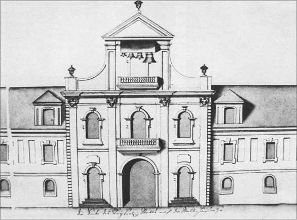 Проект перестройки конюшен Руска выполнил в 1804 году. Л.Б. Александрова, автор книги о зодчем, считает его принципиальным нововведением перенос церкви из западной части в центр здания[42]. Однако церковь размещалась посередине южного фасада изначально! Об этом свидетельствуют все изображения XVIII века. Тем не менее о вымышленном перемещении церкви сообщают вслед за Л.Б. Александровой и другие авторы.