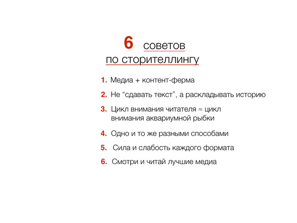 В конечном итоге все, что мы, журналисты, делаем – от новостей до аналитики – это процесс рассказа историй, сторителлинг. И очень важный элемент мультимедийной культуры – взявшись за тему, задавать себе вопрос не «что мы об этом напишем?», а «как мы об этом расскажем?». Ведь историю можно рассказать в карикатурах, подкастах, тестах, картинках-слайдерах, цифрах и много чем еще.