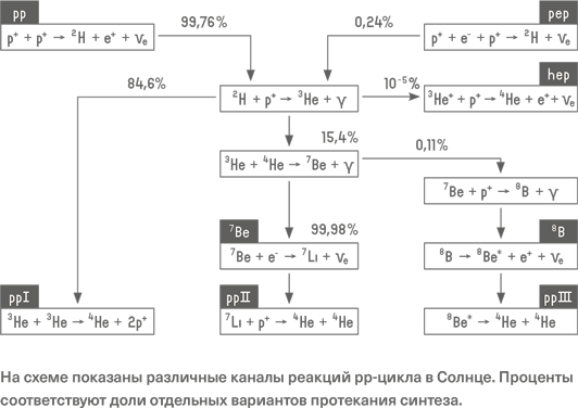 Основной канал называют pp-цепочкой, или pp-циклом, на первом шаге которого в реакцию вступают два протона (p). Однако даже эта реакция идет в недрах Солнца в двух вариантах. Основной (99,76 % случаев) состоит во взаимодействии двух протонов, в результате чего образуется дейтерий (один из протонов превращается в нейтрон), рождаются позитрон и электронное нейтрино. Эти нейтрино имеют низкую энергию, поэтому их удалось детально исследовать лишь недавно, в 2014 г., на установке Borexino в Италии.