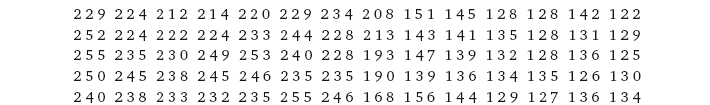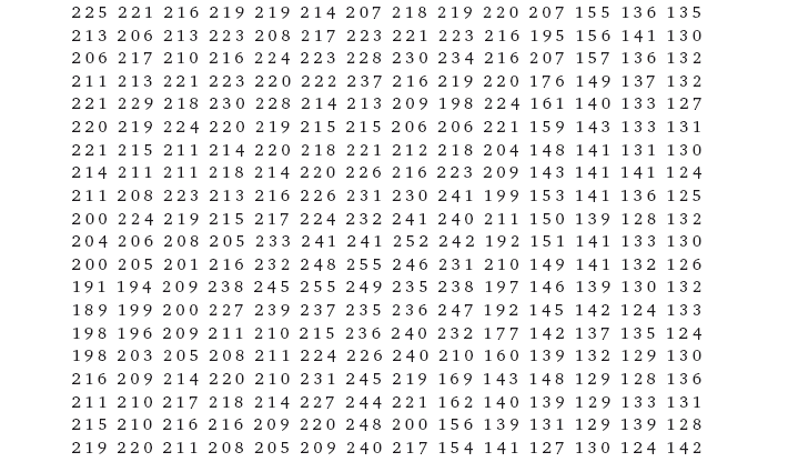 Каждое число здесь соответствует яркости одного из миллиона крохотных участков, вместе составляющих поле зрения. Числа поменьше соответствуют более темным участкам, а числа побольше – светлым участкам. Эти числа, сгруппированные в виде массива, на самом деле представляют собой сигналы, полученные с цифровой камеры, с помощью которой для пробы сделали снимок руки человека. Однако точно таким же образом можно было бы представить частоту разрядов в нервных волокнах, соединяющих глаз человека с мозгом в тот момент, когда человек смотрит на руку