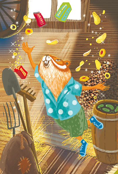 Хомс видел прекрасный сон. Во сне он был молод и строен. Он сидел посреди деревенского амбара, а вокруг кружились самые аппетитные вещи, какие только можно было себе представить: ячменные чипсы, овсяные хлопья, жареная кукуруза… Молодой и стройный Хомс хватал на лету эти вредные для талии вкусности и засовывал в свои защёчные мешки. Щеки всё раздувались, раздувались и сделались такими огромными, что Хомс не устоял под их тяжестью и упал на землю. Гигантские щёки с оглушительным треском лопнули, и на хомяка обрушился поток запасённой им еды…