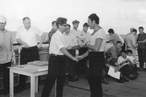 Судно легло в дрейф. Солнце палит нещадно. Праздничные флаги, которыми украшено судно еле шевелятся. Почти полный штиль. На носовом трюме около бассейна установлен трон для морского царя Нептуна. Весь состав экспедиции и члены экипажа, свободные от вахты, собрались на пеленгаторной палубе.