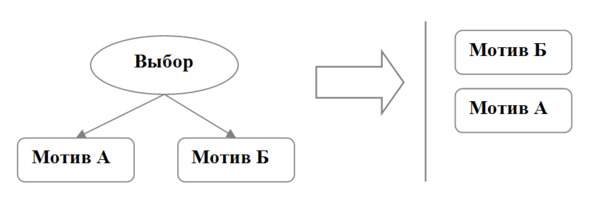 Теперь мы можем сказать, что структура мотивов формируется в условиях противоречия и неопределенности. Такое состояние можно назвать емким словом кризис, которое мы рассмотрим несколько позже в Ф.7.2. Конфликт мотивов приводит к борьбе, которая в конечном итоге определят, какой из них станет доминирующим, а какой подчиненным. Давайте изобразим этот процесс на схеме.