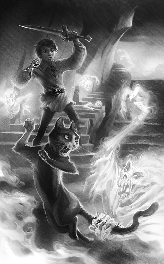 Джек проверил, не потерял ли сумочку с ингредиентами, – вот она, на плече. И палочка на месте – заткнута за пояс. Убедившись, что все в порядке, мальчик вынул из ножен короткий меч и выпрыгнул из лодки. Элдвину проверять и вытаскивать из ножен нечего – из оружия у него только разум. Поэтому он просто зашагал вслед за верным по унылому берегу. Кот и мальчик шли к выбитой в камне извилистой лестнице, и галечные крабы с прибрежными омарами удирали от них врассыпную.