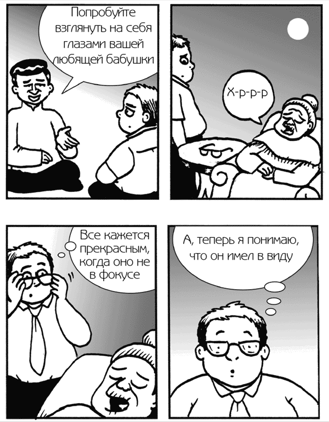 Один из лучших способов сделать это – развить то, что ребята из дзен называют умом бабушки: позаимствовать ум любящей бабушки. Для любящей бабуленьки вы прекрасны и совершенны во всех своих проявлениях. Сколько бы вы ни шалили, вы совершенны, и бабушка любит вас таким, какой вы есть. Это не значит, что она не замечает ваших недостатков или позволяет вам вредить самому себе. Иногда она даже строго вмешивается в ваши дела, чтобы не позволить вам впутаться в большие неприятности. Но несмотря ни на что, для нее вы совершенство, и она любит вас. Практика заключается в том, чтобы увидеть себя глазами любящей бабушки.