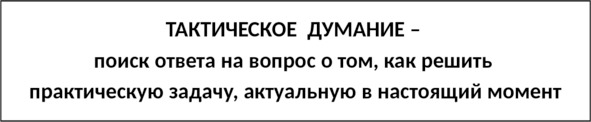 С тактическим думанием дело обстоит по-другому. Оно каждый раз решает некую конкретную жизненную задачу – достаточно сложную, чтобы для ее решения не хватало имеющихся в распоряжении человека эффективных шаблонов, условных рефлексов (уж извините…), типовых действий и т. д.