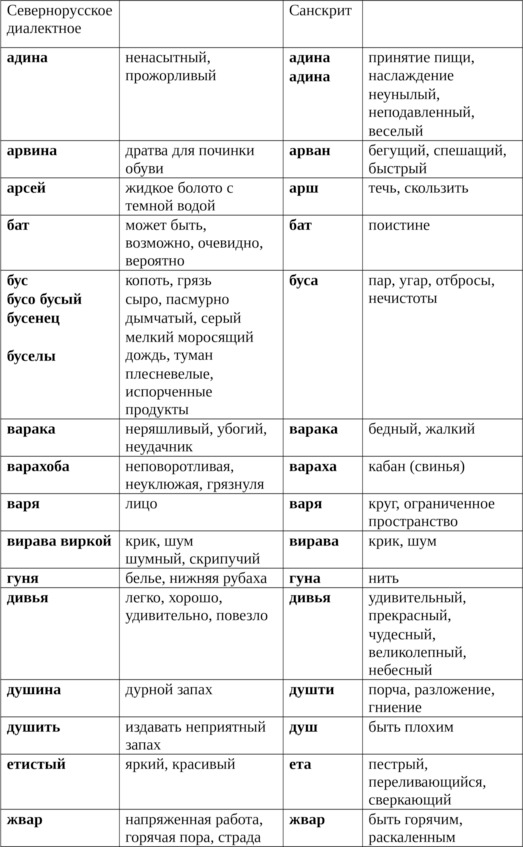 Мы пользуемся таким словом как «гать», «гати» в значении – дорога, проложенная по болоту, но в санскрите «гати» – проход, путь, дорога. Санскритскому слову «гали» – оскорбительные речи, ругательства, есть русский аналог – «изгаляться», «галиться»; санскритскому «дра» – идти, бежать – соответствует русское «драпать»; слову «радана» – плач, слезы, наше – «рыдание»; санскритскому «вакья» – слово, разговор, русское «вякать». Зачастую мы просто пользуемся тавтологиями, соединяя два слова с абсолютно одинаковым значением: мы говорим «трын-трава», но в санскрите «трин» и значит «трава»; мы говорим «карнаухий», но в санскрите «карна» и значит ухо; мы говорим «дремучий лес», но в санскрите «друма» и значит дерево. Эти примеры можно было бы продолжать еще долго. Так, например, в вологодских и архангельских диалектах встречаются такие слова, сохранившиеся с глубокой древности: