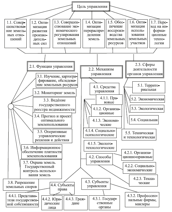 Как было отмечено выше, главная цель управления земельными ресурсами – это обеспечение эффективного использования земли для выполнения основной задачи рыночной экономики – получения максимальной прибыли в интересах удовлетворения потребностей отдельного человека, юридических лиц и общества в целом, а также укрепления нравственных основ развития общества. Это – нулевой уровень структуры управления.