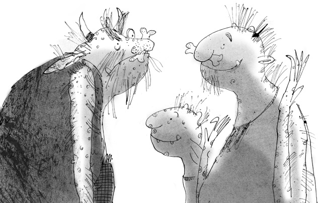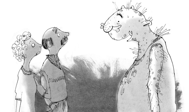 Мистер Приддл открыл дверь и отступил при виде трёх улыбающихся троллей, которые стояли на пороге. Миссис Тролль надела своё лучшее платье – с оборочками на короткой юбке, едва прикрывающей толстые волосатые ноги.