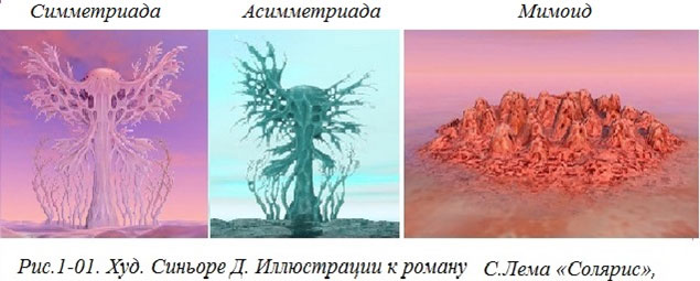 Но какое содержание стоит за ними? Симметриада – это просто что-то симметричное. Соответственно Асимметриада – асимметричное. А что изображено на рисунке Мимоида уже догадаться невозможно. Так что как иллюстрации к литературному произведению эти рисунки возражений не вызывают. Но они совсем не годятся для соляристики, понимаемой в рамках идей Вернадского, то есть соляристики не как литературной фантазии, а как подлинной науки. Да это вряд ли по силам художникам. Скорей это должны делать профессиональные архитекторы и дизайнеры. И не путем досужего фантазирования, а как результат серьезного научного анализа.