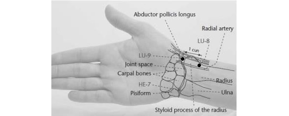 Точка P8 цзин-цюй: В ямке в точке цунь-коу на запястье, где определяется пульс. Глубина укола составляет 2 фэня. Меридиан легких, великой инь на руке, проходя в этом месте, образует точку цзин (тракт) меридиана, которой соответствует стихия «металл».